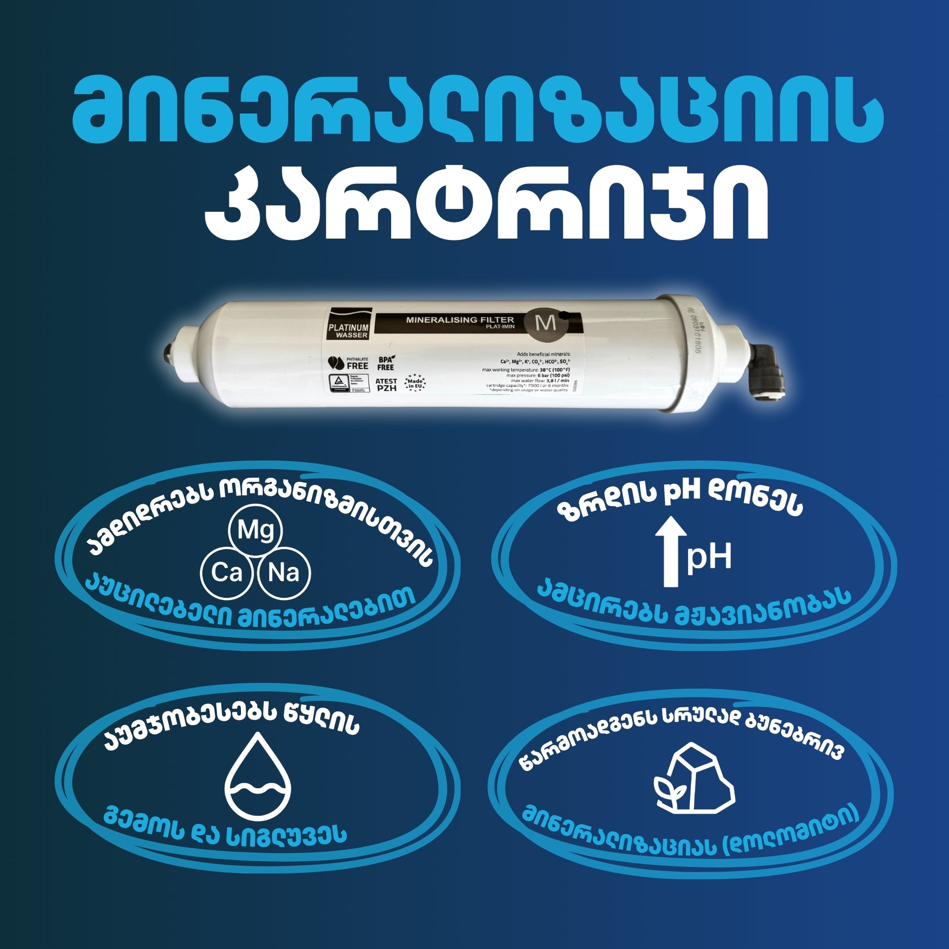 კარტრიჯი შეიცავს ბუნებრივ მინერალიზატორ დოლომიტს, რომელიც ამდიდრებს წყალს ჯანმრთელობისთვის აუცილებელი მინერალებით, მათ შორის კალციუმით, მაგნიუმით და ნატრიუმით. ზრდის pH-ს და აუმჯობესებს გაფილტრული წყლის გემოს, აღადგენს მის ბუნებრივ მინერალურ ბალანსს. (PLAT-IMIN-QC)